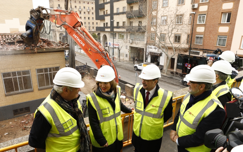 Zaragoza, 14 de febrero de 2019.- Con la puesta en marcha de la demolición el Pabellón de Filología se hace ya visible al exterior la reforma de la Facultad de Filosofía y Letras. El proyecto de reforma contempla la construcción de un nuevo edificio en sustitución del actual Pabellón de Filología, la rehabilitación del conjunto histórico y la urbanización del entorno de la Facultad. El Presidente de Aragón, Javier Lambán, ha asistido al comienzo de los trabajos de la retroexcavadora para el derribo, acompañado de la consejera de Innovación, Investigación y Universidad, Pilar Alegría, el Rector, el Decano de la Facultad y resto de miembros del equipo y de la empresa encargada de las obras.