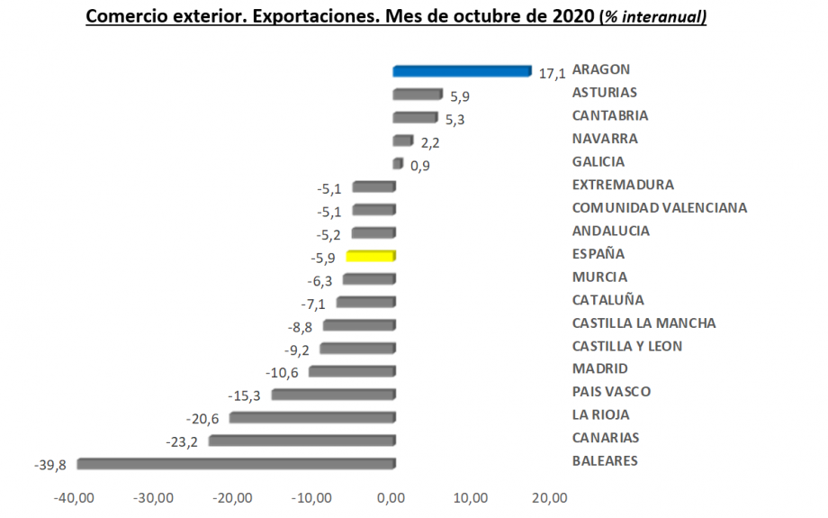 Zaragoza, 18 de diciembre de 2020.- De acuerdo con los datos hechos públicos este viernes por el Ministerio de Industria, Comercio y Turismo, las exportaciones aragonesas registraron un incremento interanual del 17,1% en el mes de octubre de 2020, mientras que en España el descenso medio fue del 5,9%. De esta forma, Aragón lidera el ranking regional de crecimiento anual de las exportaciones durante el mes de octubre.